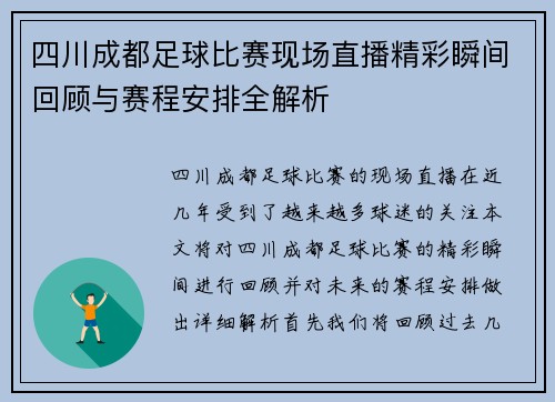 四川成都足球比赛现场直播精彩瞬间回顾与赛程安排全解析
