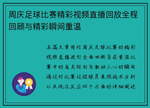 周庆足球比赛精彩视频直播回放全程回顾与精彩瞬间重温