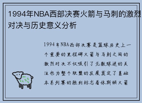 1994年NBA西部决赛火箭与马刺的激烈对决与历史意义分析