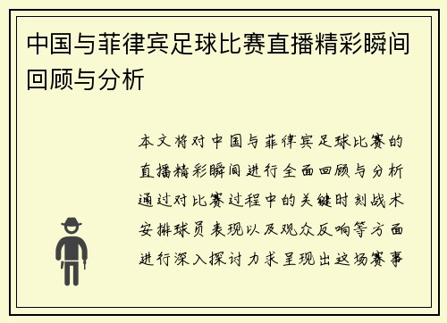中国与菲律宾足球比赛直播精彩瞬间回顾与分析